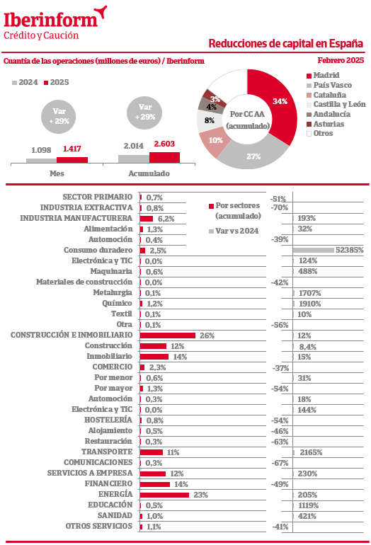 De acuerdo con el seguimiento que realiza Iberinform de los datos publicados en el Registro Mercantil, el número de reducciones de capital en el tejido empresarial ha registrado en febrero un aumento interanual del 6%. En el acumulado, el número de reducciones registra una subida del 2,7%. En cuanto a su importe, el saldo agregado en los dos primeros meses del año refleja un crecimiento del 29%. El principal motivo por el que se lleva a cabo una reducción de capital es la compensación del impacto de las pérdidas económicas en el patrimonio neto. En este sentido, la sociedad puede reducirlo con el fin de establecer una estructura financiera más acorde a su nueva situación.