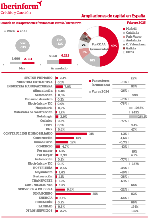 Respecto a las ampliaciones de capital, de acuerdo con el seguimiento que realiza Iberinform de los datos publicados en el Registro Mercantil, el número de operaciones ha registrado un decrecimiento interanual del -3,6% en febrero y un decrecimiento del -0,9% en el conjunto del año. En cuanto al importe de las ampliaciones, el saldo agregado de estas operaciones que refuerzan la solvencia empresarial acumula una subida del 12% en 2025.