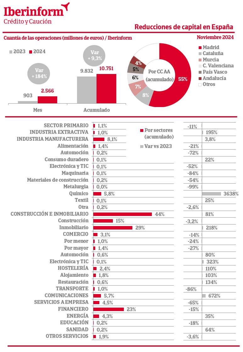 De acuerdo con el seguimiento que realiza Iberinform de los datos publicados en el Registro Mercantil, el número de reducciones de capital en el tejido empresarial ha registrado en noviembre un aumento interanual del 4,8%. En el conjunto de 2024, el número de reducciones registra una bajada del -1,7%. En cuanto a su importe, el saldo agregado en los once primeros meses del año refleja un crecimiento del 9,3%. El principal motivo por el que se lleva a cabo una reducción de capital es la compensación del impacto de las pérdidas económicas en el patrimonio neto. En este sentido, la sociedad puede reducirlo con el fin de establecer una estructura financiera más acorde a su nueva situación.