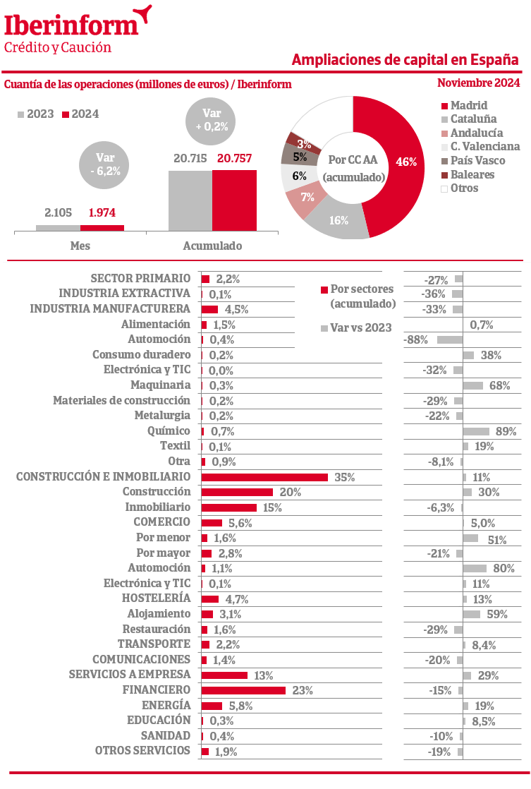 Respecto a las ampliaciones de capital, de acuerdo con el seguimiento que realiza Iberinform de los datos publicados en el Registro Mercantil, el número de operaciones ha registrado un crecimiento interanual del 4,8% en noviembre y un decrecimiento del -1,4% en el conjunto del año. En cuanto al importe de las ampliaciones, el saldo agregado de estas operaciones que refuerzan la solvencia empresarial acumula una subida del 0,2% en 2024.