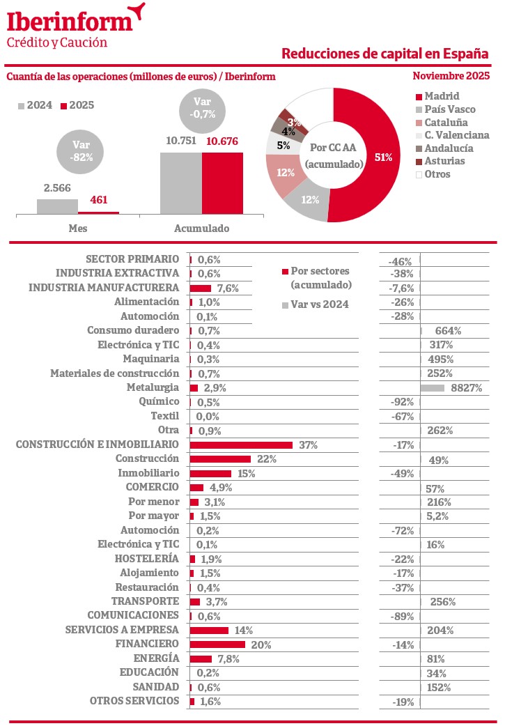 De acuerdo con el seguimiento que realiza Iberinform de los datos publicados en el Registro Mercantil, el número de reducciones de capital en el tejido empresarial ha registrado en noviembre un aumento interanual del 10%. En el acumulado, el número de reducciones registra una subida del 2,8%. En cuanto a su importe, el saldo agregado en los once primeros meses del año refleja una disminución del -0,7%, con respecto al mismo periodo de 2024. El principal motivo por el que se lleva a cabo una reducción de capital es la compensación del impacto de las pérdidas económicas en el patrimonio neto. En este sentido, la sociedad puede reducirlo con el fin de establecer una estructura financiera más acorde a su nueva situación.