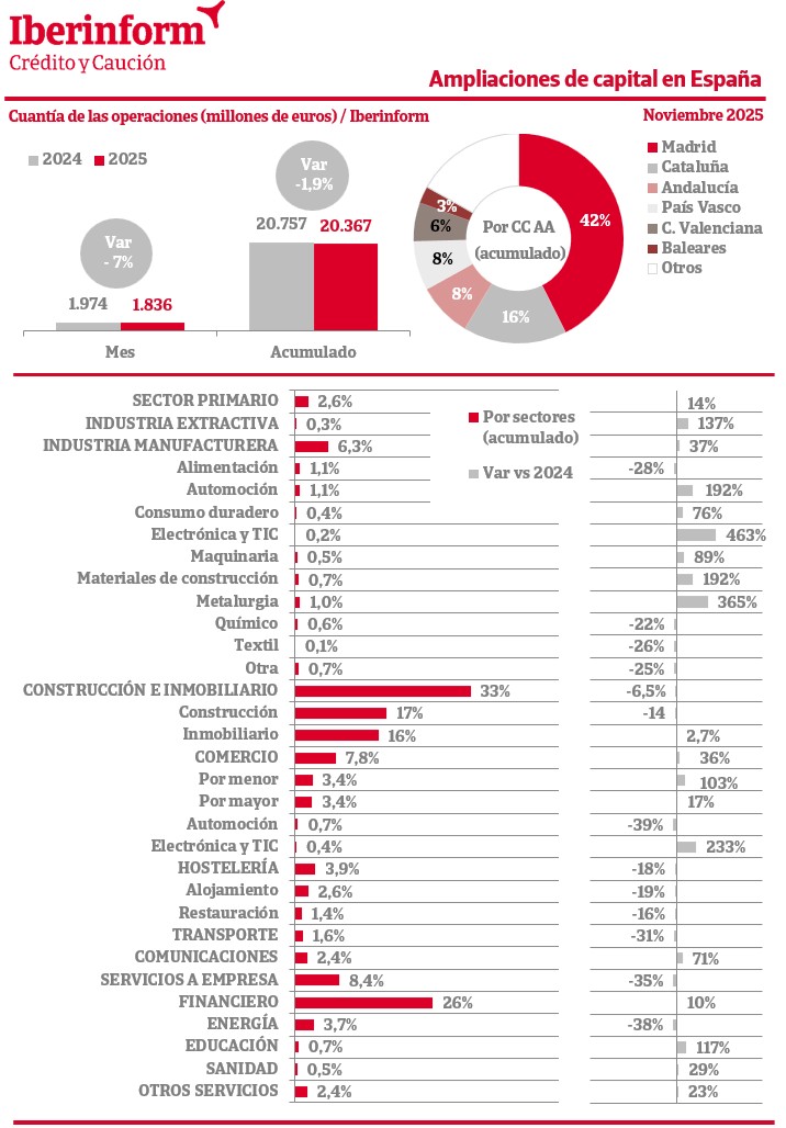 Respecto a las ampliaciones de capital, de acuerdo con el seguimiento que realiza Iberinform de los datos publicados en el Registro Mercantil, el número de operaciones ha registrado en noviembre un crecimiento interanual del 1%, mientras en el conjunto del año el incremento es de apenas el 1,3%. En cuanto al importe de las ampliaciones, el saldo agregado de estas operaciones que refuerzan la solvencia empresarial acumula una bajada del -1,9% en 2025 y un decrecimiento interanual del -7% en noviembre.