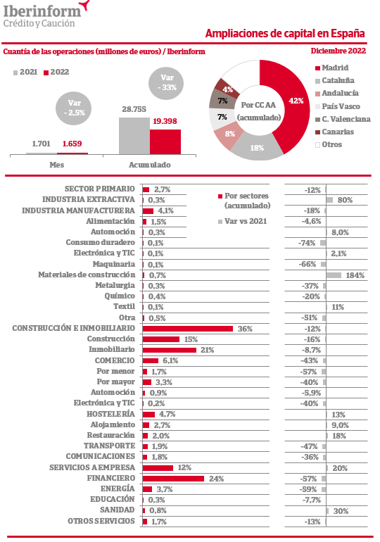 Respecto a las ampliaciones de capital, de acuerdo con el seguimiento que realiza Iberinform de los datos publicados en el Registro Mercantil, el número de operaciones ha registrado un decrecimiento interanual del -9,1% en diciembre y del -0,6% en el conjunto del año. Los datos del Registro Mercantil muestran que los importes de las ampliaciones de capital son sensiblemente más modestos. El saldo agregado de estas operaciones que refuerzan la solvencia empresarial acumuló una caída del -33% en 2022.