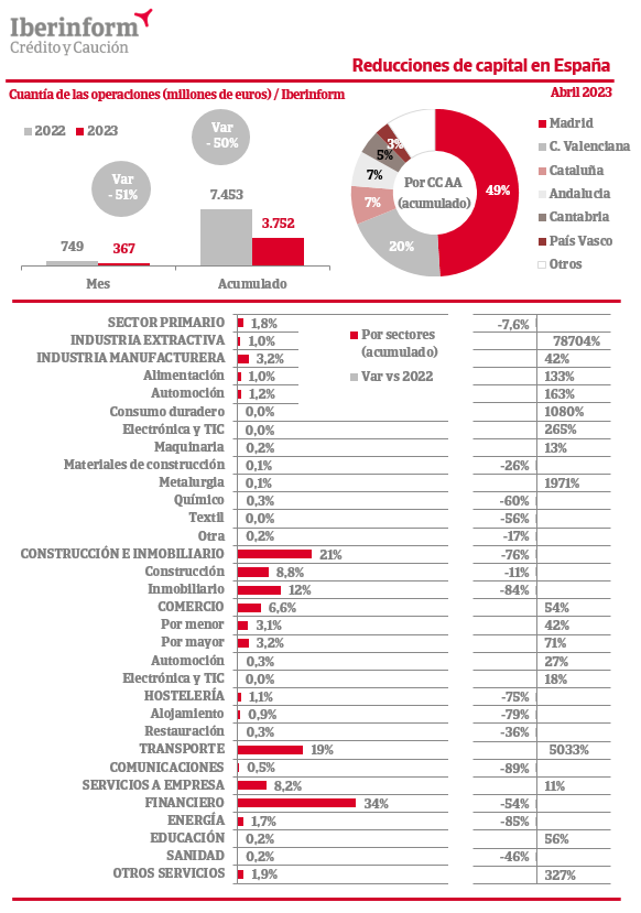 De acuerdo con el seguimiento que realiza Iberinform de los datos publicados en el Registro Mercantil, el número de reducciones de capital en el tejido empresarial ha registrado en abril una disminución interanual del 3,8%. En el conjunto de 2023, el número de reducciones registra una subida del 4,5%. A pesar de que el número de operaciones apenas ha variado, sí lo ha hecho de forma significativa su importe: el saldo agregado en los cuatro primeros meses del año refleja un decrecimiento del -50%. El principal motivo por el que se lleva a cabo una reducción de capital es la compensación del impacto de las pérdidas económicas en el patrimonio neto. En este sentido, la sociedad puede reducirlo con el fin de establecer una estructura financiera más acorde a su nueva situación.