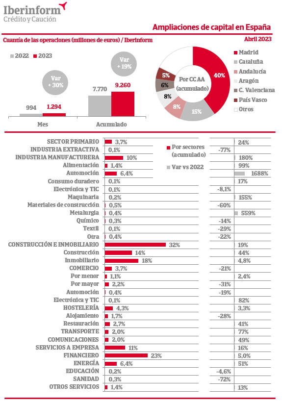 Respecto a las ampliaciones de capital, de acuerdo con el seguimiento que realiza Iberinform de los datos publicados en el Registro Mercantil, el número de operaciones ha registrado un crecimiento interanual del 4,8% en abril y del 6,9% en el conjunto del año. Los datos del Registro Mercantil muestran que los importes de las ampliaciones de capital son sensiblemente más modestos. El saldo agregado de estas operaciones que refuerzan la solvencia empresarial acumula una subida del 19% en 2023.