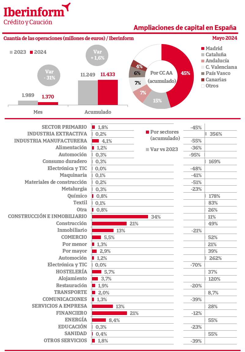Respecto a las ampliaciones de capital, de acuerdo con el seguimiento que realiza Iberinform de los datos publicados en el Registro Mercantil, el número de operaciones ha registrado un decrecimiento interanual del -14% en mayo y un decrecimiento del -1,5% en el conjunto del año.. En cuanto al importe de las ampliaciones, el saldo agregado de estas operaciones que refuerzan la solvencia empresarial acumula una subida del 1,6% en 2024.