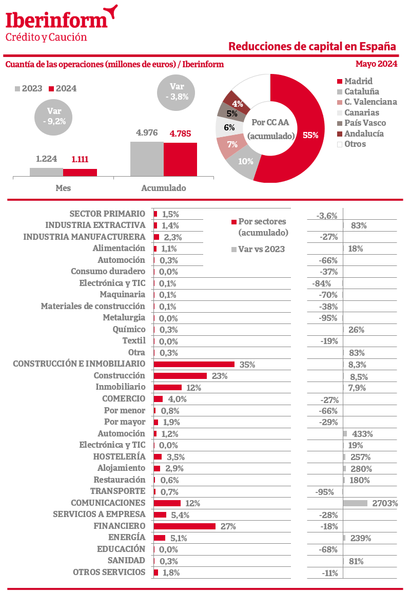 De acuerdo con el seguimiento que realiza Iberinform de los datos publicados en el Registro Mercantil, el número de reducciones de capital en el tejido empresarial ha registrado en mayo una disminución interanual del 23%. En el conjunto de 2024, el número de reducciones registra una bajada del -2,7%. A pesar de que el número de operaciones apenas ha variado, sí lo ha hecho de forma significativa su importe: el saldo agregado en los cinco primeros meses del año refleja un decrecimiento del -3,8%. El principal motivo por el que se lleva a cabo una reducción de capital es la compensación del impacto de las pérdidas económicas en el patrimonio neto. En este sentido, la sociedad puede reducirlo con el fin de establecer una estructura financiera más acorde a su nueva situación.