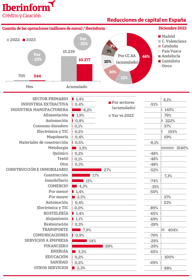 De acuerdo con el seguimiento que realiza Iberinform de los datos publicados en el Registro Mercantil, el número de reducciones de capital en el tejido empresarial ha registrado en diciembre una reducción interanual del -2,3%. En el conjunto de 2023, el número de reducciones registra una subida del 4,4%. A pesar de que el número de operaciones apenas ha variado, sí lo ha hecho de forma significativa su importe: el saldo agregado en los doce meses del año refleja un decrecimiento del -32%. El principal motivo por el que se lleva a cabo una reducción de capital es la compensación del impacto de las pérdidas económicas en el patrimonio neto. En este sentido, la sociedad puede reducirlo con el fin de establecer una estructura financiera más acorde a su nueva situación.