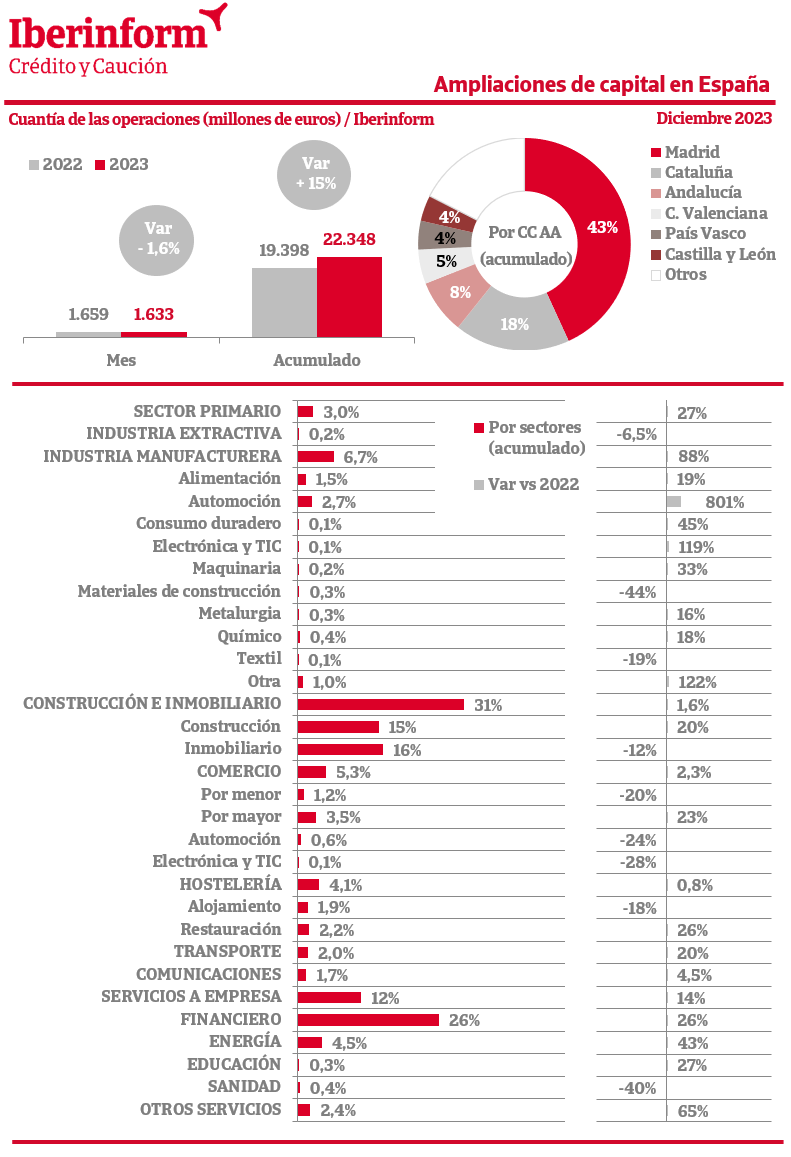 Respecto a las ampliaciones de capital, de acuerdo con el seguimiento que realiza Iberinform de los datos publicados en el Registro Mercantil, el número de operaciones ha registrado un decrecimiento interanual del -10% en diciembre y un crecimiento del 3,2% en el conjunto del año. Los datos del Registro Mercantil muestran que los importes de las ampliaciones de capital son sensiblemente más modestos. El saldo agregado de estas operaciones que refuerzan la solvencia empresarial acumula una subida del 15% en 2023.