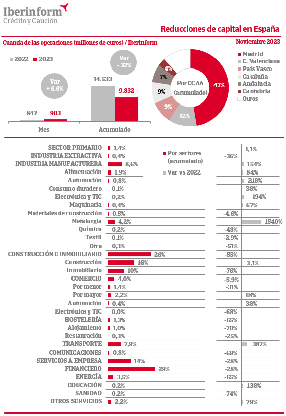 De acuerdo con el seguimiento que realiza Iberinform de los datos publicados en el Registro Mercantil, el número de reducciones de capital en el tejido empresarial ha registrado en noviembre una reducción interanual del -11%. En el conjunto de 2023, el número de reducciones registra una subida del 5%. A pesar de que el número de operaciones apenas ha variado, sí lo ha hecho de forma significativa su importe: el saldo agregado en los once primeros meses del año refleja un decrecimiento del -32%. El principal motivo por el que se lleva a cabo una reducción de capital es la compensación del impacto de las pérdidas económicas en el patrimonio neto. En este sentido, la sociedad puede reducirlo con el fin de establecer una estructura financiera más acorde a su nueva situación.