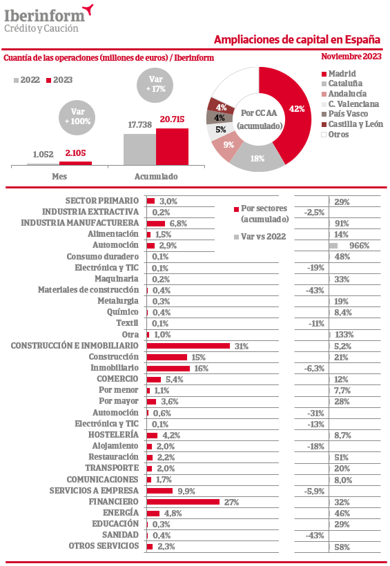 Respecto a las ampliaciones de capital, de acuerdo con el seguimiento que realiza Iberinform de los datos publicados en el Registro Mercantil, el número de operaciones ha registrado un decrecimiento interanual del -4,8% en noviembre y un crecimiento del 4,4% en el conjunto del año. Los datos del Registro Mercantil muestran que los importes de las ampliaciones de capital son sensiblemente más modestos. El saldo agregado de estas operaciones que refuerzan la solvencia empresarial acumula una subida del 17% en 2023.
