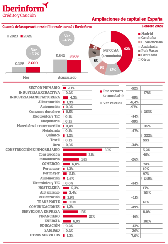 Respecto a las ampliaciones de capital, de acuerdo con el seguimiento que realiza Iberinform de los datos publicados en el Registro Mercantil, el número de operaciones ha registrado un crecimiento interanual del 5,9% en febrero y un crecimiento del 2,1% en el conjunto del año. Los datos del Registro Mercantil muestran que los importes de las ampliaciones de capital son sensiblemente más modestos. El saldo agregado de estas operaciones que refuerzan la solvencia empresarial acumula una bajada del -4,7% en 2024.