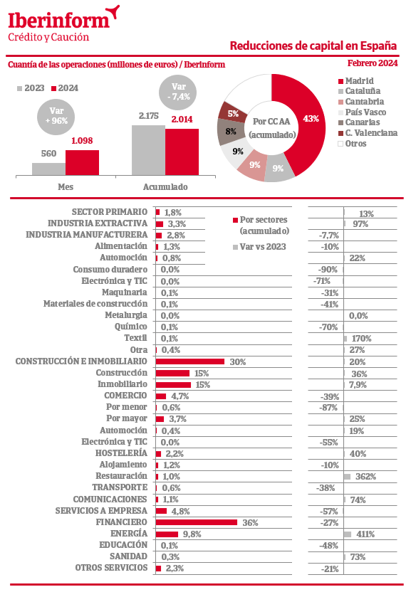 De acuerdo con el seguimiento que realiza Iberinform de los datos publicados en el Registro Mercantil, el número de reducciones de capital en el tejido empresarial ha registrado en febrero un aumento interanual del 0,9%. En el conjunto de 2024, el número de reducciones registra una bajada del -0,4%. A pesar de que el número de operaciones apenas ha variado, sí lo ha hecho de forma significativa su importe: el saldo agregado en los dos primeros meses del año refleja un decrecimiento del -7,4%. El principal motivo por el que se lleva a cabo una reducción de capital es la compensación del impacto de las pérdidas económicas en el patrimonio neto. En este sentido, la sociedad puede reducirlo con el fin de establecer una estructura financiera más acorde a su nueva situación.