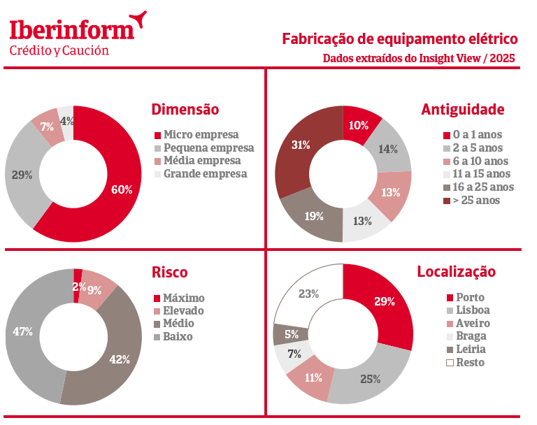 A maioria esmagadora dos fabricantes de equipamento elétrico são micro (60%) e pequenas empresas (28%), totalizando 89% do setor. As médias e grandes empresas representam uma fatia menor, com 7% e 4%, respetivamente, ainda assim, a sua contribuição para o volume de negócios do setor é extremamente elevada, com uma percentagem de 90%. Quanto ao risco, nestas empresas médias e grandes, é consideravelmente mais baixo que nas restantes.