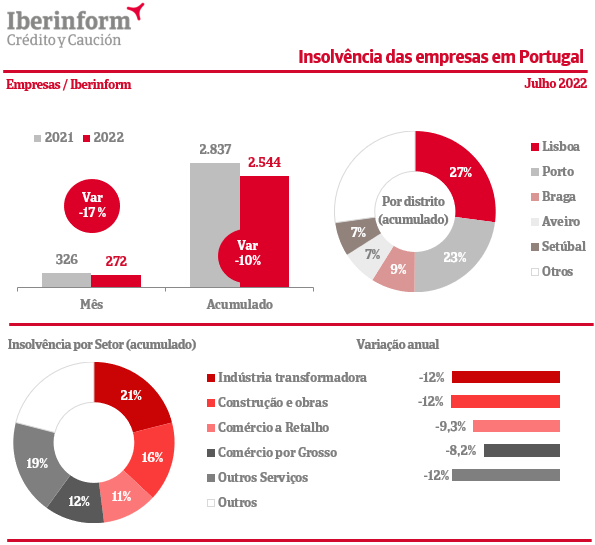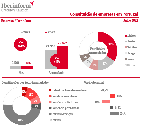 Até final de julho de 2022, os setores que apresentaram uma variação positiva na constituição de novas empresas são: Transportes (+124%); Hotelaria e Restauração (+24%), Outros Serviços (+21%;); Telecomunicações (+21%); Eletricidade, Gás, Água (+13%); Construção e Obras Públicas (+11%); Comércio de Veículo (+8,0%) e Comércio por Grosso (+6,5%).