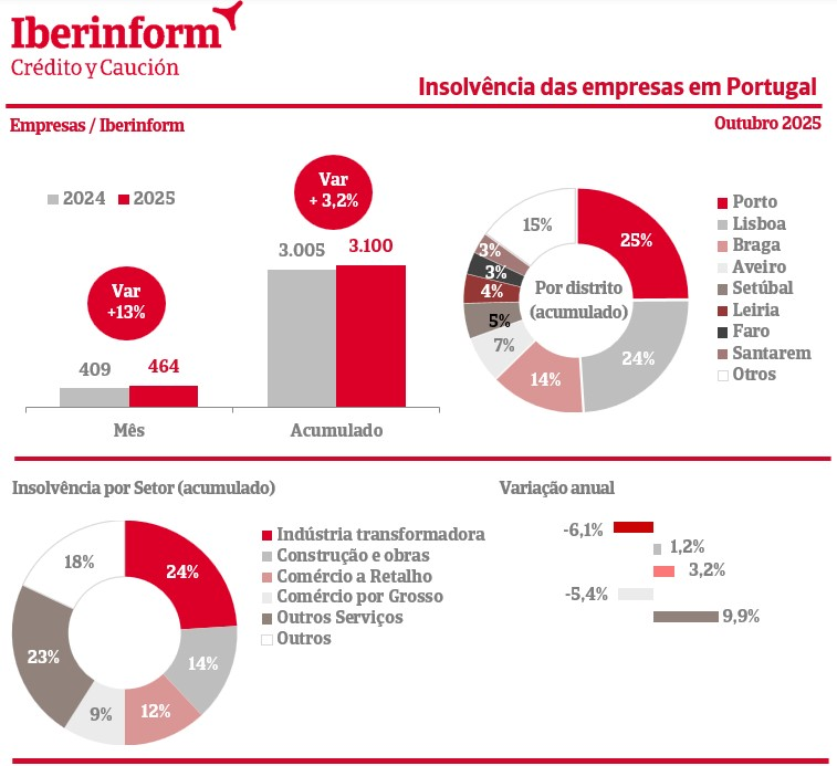 O mercado empresarial português iniciou o quarto trimestre de 2025 com sinais mistos segundo dados da Iberinform. O número de empresas insolventes registou um incremento de 3,2% face ao mesmo período do ano anterior, totalizando mais 95 processos de insolvência até outubro. Só no mês de outubro foram registadas 464 insolvências, mais 55 do que em outubro de 2024, traduzindo-se num aumento de 13%.
