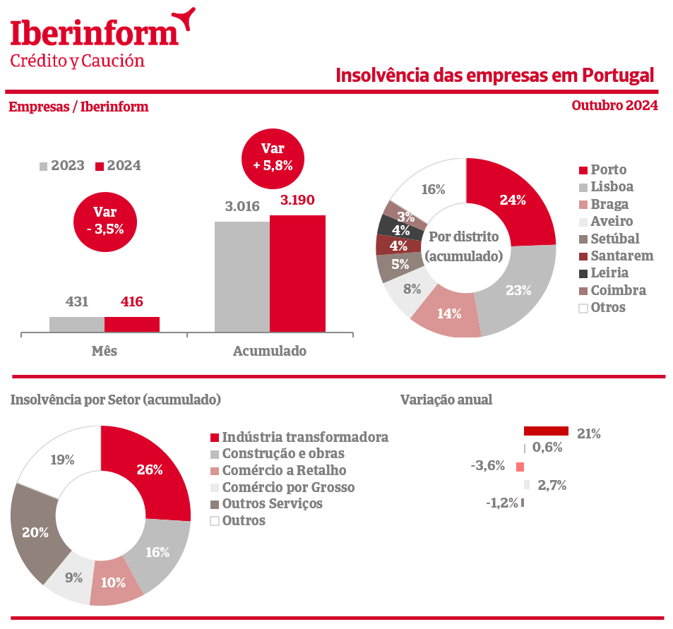 As insolvências registaram um decréscimo de 3,5% em outubro face ao período homólogo do ano passado, embora o acumulado do ano revele um incremento de 6% no comparativo com 2023.