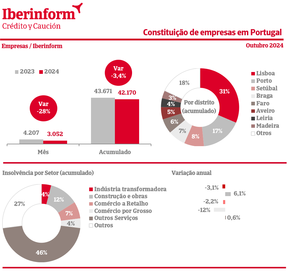 A constituição de novas empresas em outubro abrandou face a 2023 com um diferencial de menos 1.155 novas empresas constituídas (decréscimo de 28%). O mês de outubro fechou com um total de 3.052 novas empresas criadas que compara com 4.207 em 2023. O acumulado do ano regista um total de 42.170 novas empresas constituídas, menos 1.501 que no período homólogo do ano passado (-3,4%).