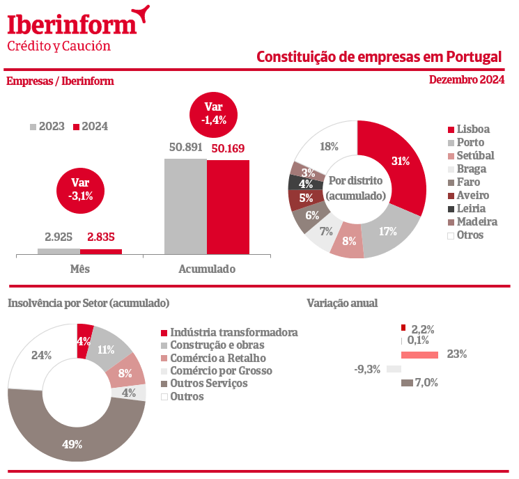 O número de constituições mais significativo verifica-se em Lisboa, com 15.741 novas empresas (-8,3% em relação a 2023), e no Porto, com 8.542 empresas (-1,2% face a 2023). Outros distritos com variação negativa são: Beja (-11%); Vila Real (-6,9%); Santarém (-2,6%); Setúbal (-1,7%) e Coimbra (-0,4%).