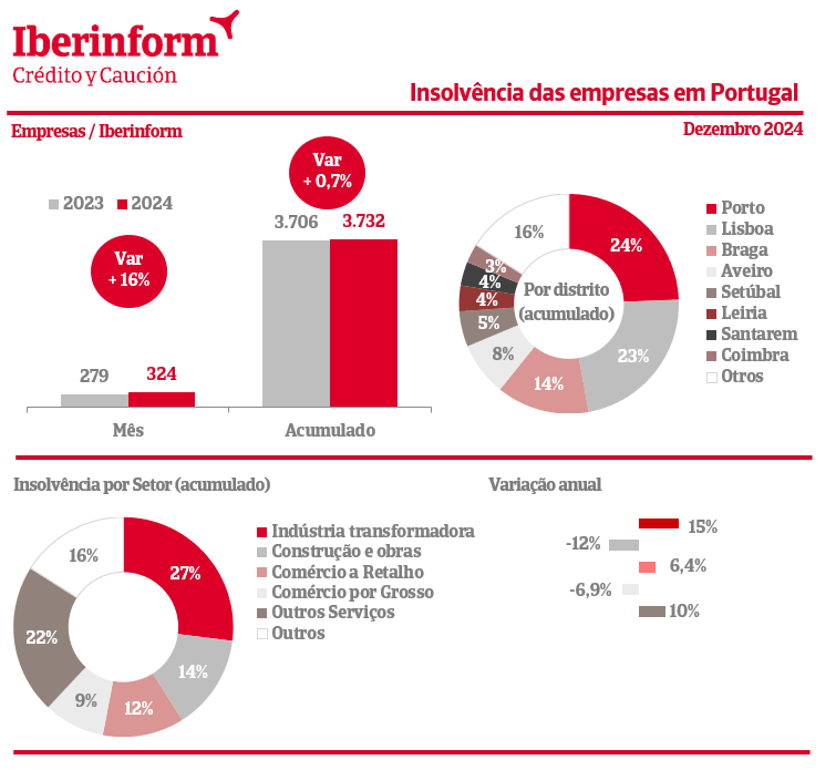 Por setores, os aumentos nas insolvências sentiram-se nas áreas de: Eletricidade, Gás, Água (+57%); Indústria Transformadora (+15%); Outros Serviços (+10%) e Comércio a Retalho (+6,4%). As atividades com decréscimo neste indicador são: Construção e Obras Públicas (-12%); Indústria Extrativa (-11%); Comércio por Grosso (-6,9%); Transportes (-5,2%) e Hotelaria e Restauração (-0,6%).