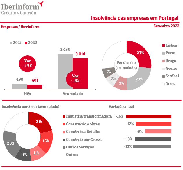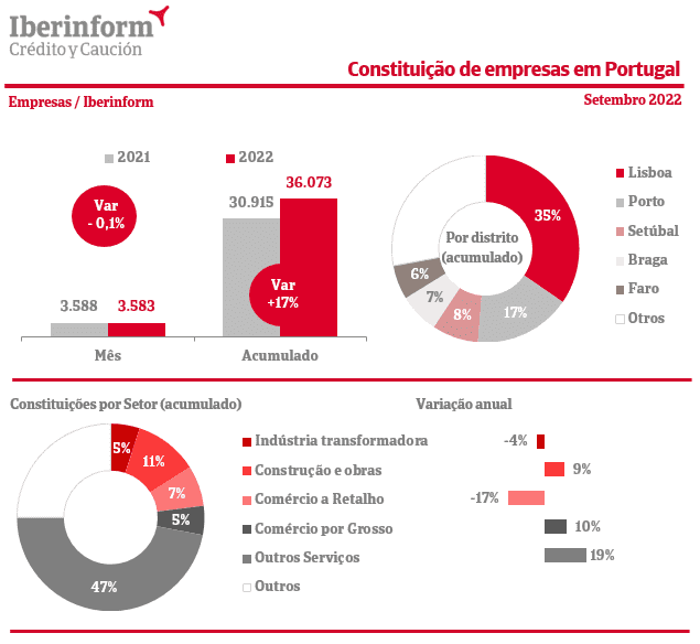 Até final de setembro de 2022, os setores que apresentam uma variação positiva na constituição de novas empresas são: Transportes (+130,1%); Telecomunicações (+29%); Hotelaria e Restauração (+22,8%); Outros serviços (+19,4%); Eletricidade, Gás e Água (+12,9%); Comércio por Grosso (+10,1%); Construção e Obras Públicas (+9,1%) e Comércio de Veículos (+9%).
