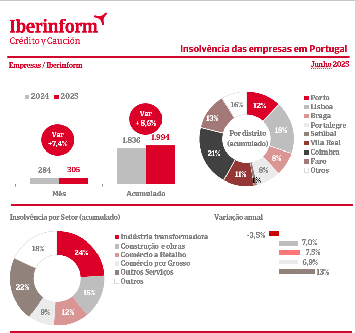 O número total de ações de insolvência aumentou 8,6% no primeiro semestre de 2025, com um total de 1.100 empresas declaradas insolventes – mais cinco do que em igual período de 2024. O mês de junho registou 305 insolvências, traduzindo-se num acréscimo de 7,4% face ao mesmo mês do ano anterior.