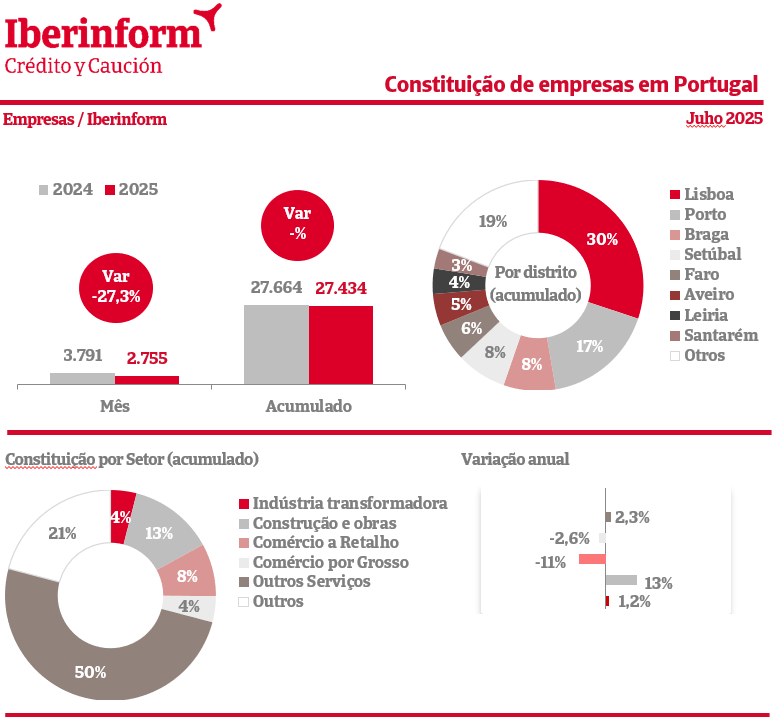 Em junho de 2025 foram constituídas 2.755 empresas, menos 1.036 face ao mesmo mês de 2024, o que representa um decréscimo de 27,3%. Em termos acumulados desde 2023, regista-se igualmente uma tendência negativa (-0,8%).