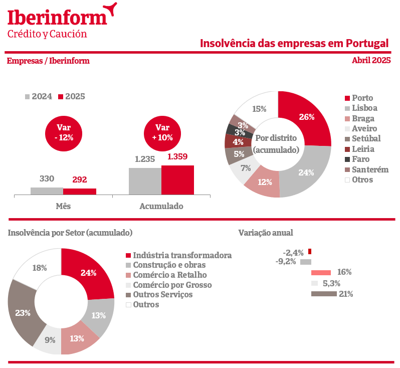Os distritos do Porto e de Lisboa mantêm a liderança em número de insolvências, com 348 e 323 insolvências, respetivamente. Face a 2024, verifica-se um acréscimo de 12% no Porto e de 15% em Lisboa.