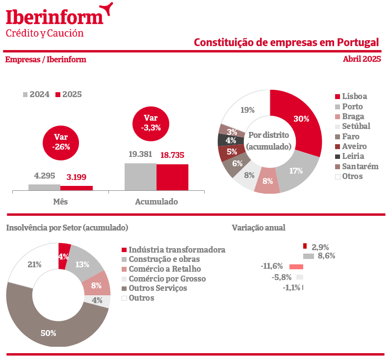As constituições diminuem 26% em abril, com uma descida de 4.295 para 3.199 novas empresas constituídas em 2025. Há igualmente um decréscimo em termos acumulados, embora mais modesto (-3%), com um total de 18.735 novas empresas criadas nos primeiros quatro meses deste ano.