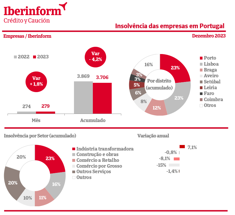 O ano de 2023 termina com uma diminuição nas insolvências, com 3.706 empresas insolventes, menos 163 que no período homólogo de 2022 (decréscimo de 4,2%).