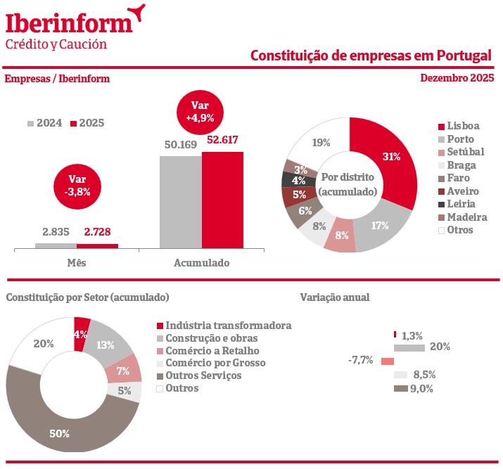 A constituição de novas empresas aumentou de 50.169 em 2024 para 52.617 em 2025, o que corresponde a um acréscimo de 2.448 empresas em termos homólogos.