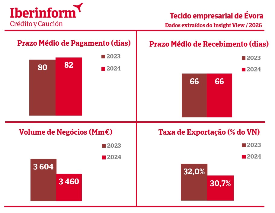 No mesmo período, o volume de negócios do distrito refletiu um recuo considerável, diminuindo de 3,6 mil milhões de euros em 2023 para 3,4 mil milhões em 2024, o que revela uma contração relevante na atividade económica. Também a taxa de exportação acompanhou esta tendência, descendo de 32 para 30,7%, mostrando uma redução da projeção internacional das empresas de Évora e evidenciando uma maior dependência do mercado interno no último ano.
