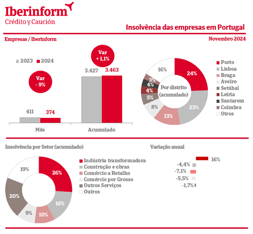As insolvências diminuíram 9% em novembro face ao mês homólogo do ano passado. O mês de novembro fechou com 374 insolvências, menos 37 que no mesmo período de 2023. As declarações de insolvência apresentadas pelas próprias empresas aumentaram mais de 18% até final de novembro, com mais 120 empresas a requererem a insolvência num total de 782 pedidos.