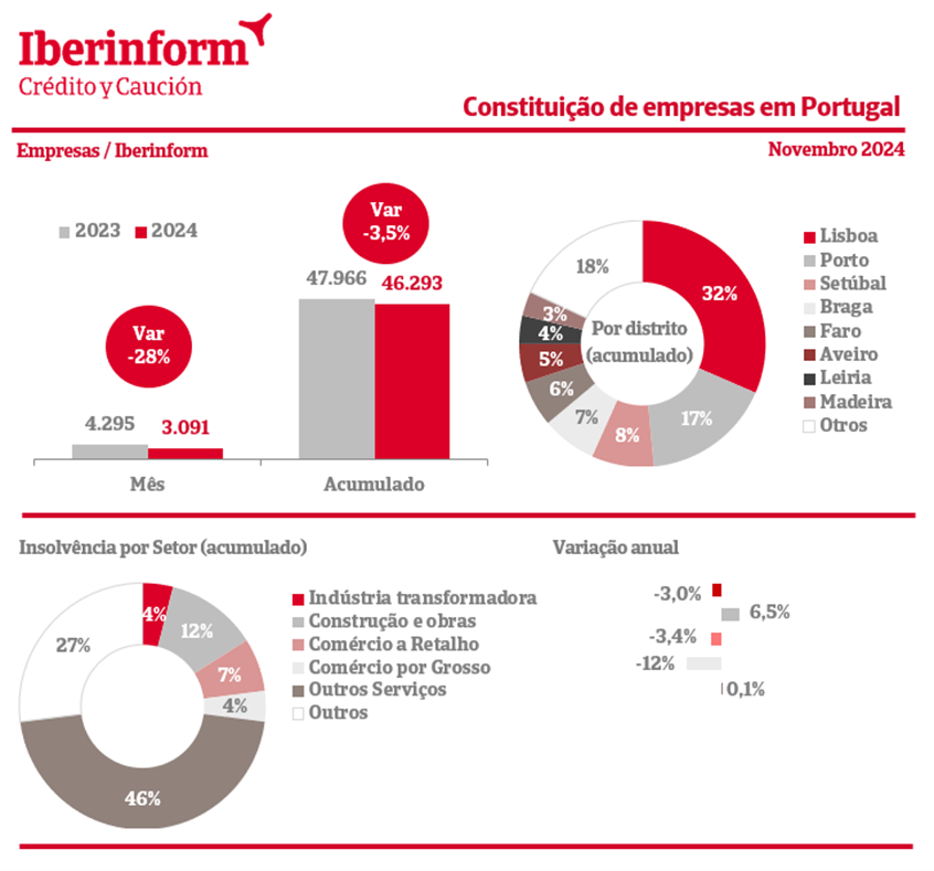 No mês de novembro foram constituídas 3.091 novas empresas, menos 1.204 que em igual período do ano passado (-28%). No total do ano foram já criadas 46.293 novas empresas o que representa um decréscimo de 3,5% face a 2023.