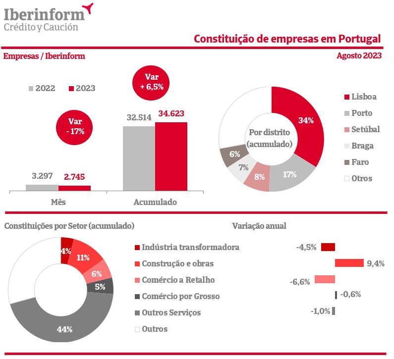 Nos primeiros oito meses do ano, os setores com variação positiva na constituição de novas empresas são: Transportes (+59%); Eletricidade, Gás, Água (+18%); Comércio de Veículos (+15%); Hotelaria e Restauração (+14%); Construção e Obras Públicas (+9,4%) e Comércio por Grosso (+0,6%). Os setores que apresentam variação negativa são: Indústria Extrativa (-58%); Telecomunicações (-28%); Comércio a Retalho (-6,6%); Indústria Transformadora (-4,5%); Outros Serviços (-1%) e Agricultura, Caça e Pesca (-0,7%).