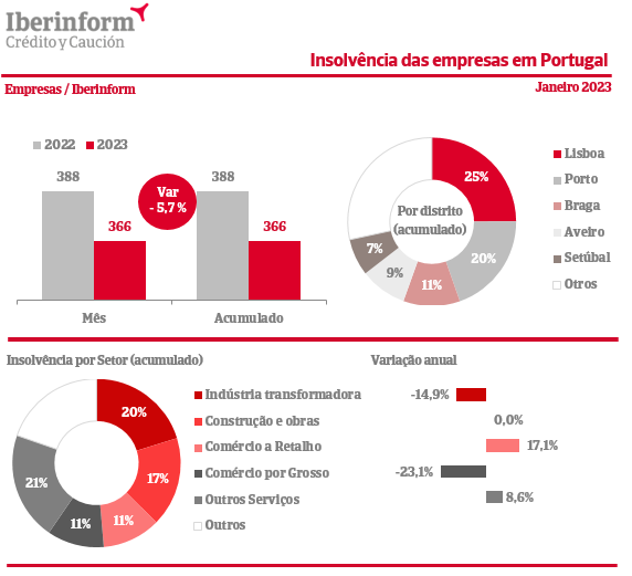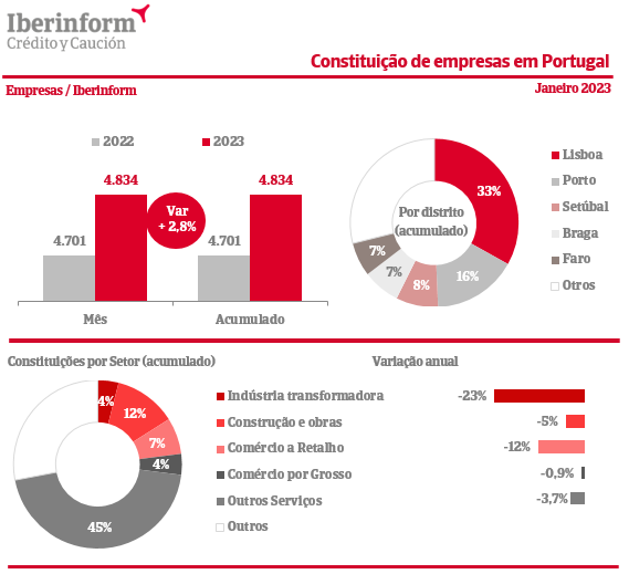 Em janeiro de 2023, os setores que apresentam uma variação positiva na constituição de novas empresas são: Transportes (+111,9%); Eletricidade, Gás, Água (+46,7%); Comércio de Veículos (+19,7%) e Hotelaria e Restauração (+14,7%).