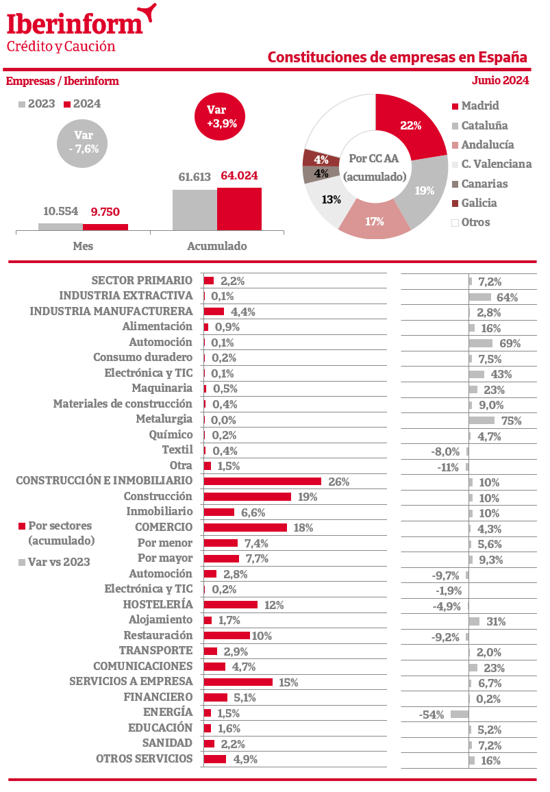 De acuerdo con el seguimiento de los registros mercantiles que realiza Iberinform, la constitución de nuevas empresas registró en junio una disminución del -7,6% respecto al mismo mes del ejercicio anterior. En el conjunto del año la creación de tejido productivo acumula una subida del 3,9%. Las nuevas firmas se concentran en Madrid (22% del total), Cataluña (19%), Andalucía (17%) y la Comunidad Valenciana (13%). Por sectores de actividad, las constituciones se concentran en construcción e inmobiliario (26% del total), seguidas de comercio (18%), servicios a empresa (15%) y hostelería (12%).