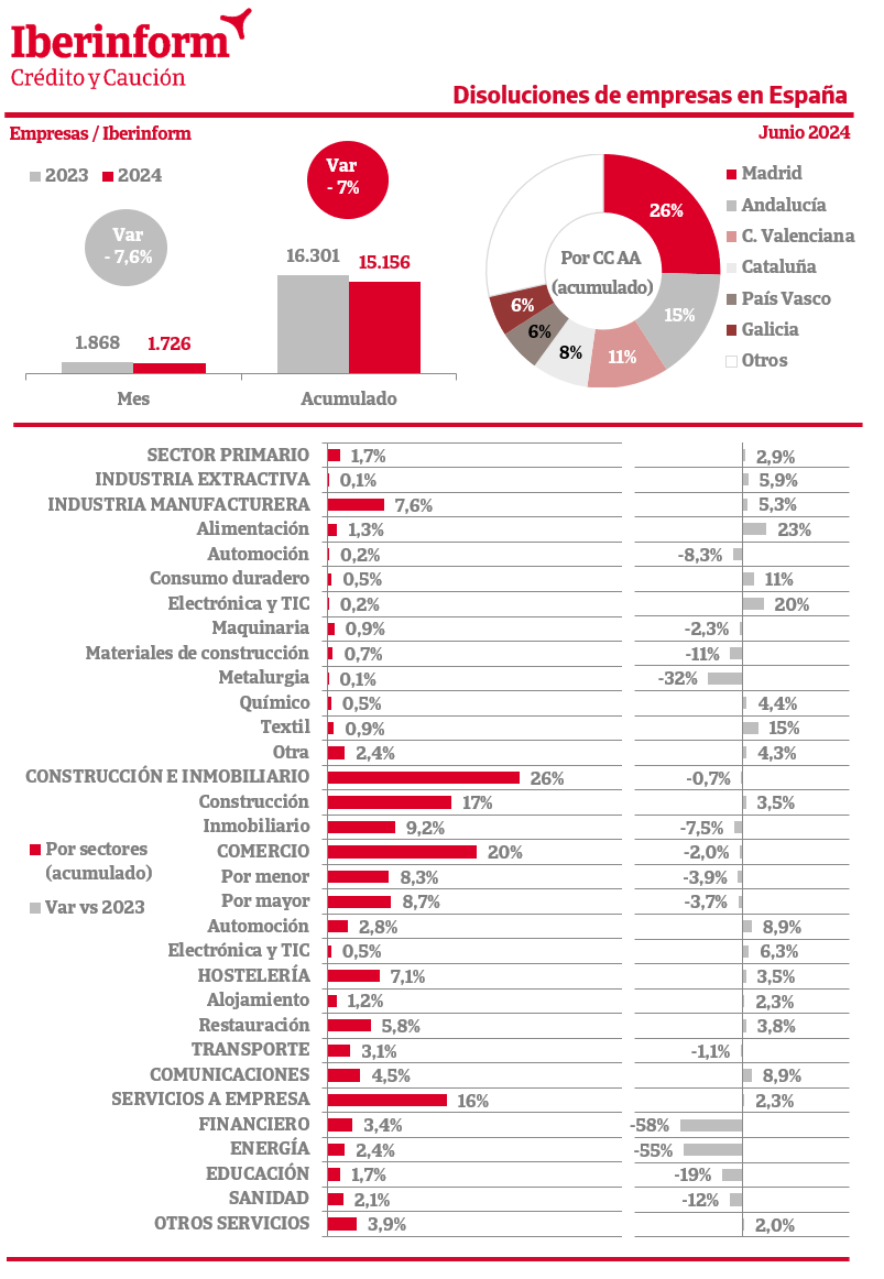 Los datos de junio muestran que la disolución de empresas registró una disminución del -7,6% respecto al mismo mes del ejercicio anterior. En el conjunto del año acumula un decrecimiento del -7%. La destrucción de tejido empresarial se concentra en Madrid (26% del total), Andalucía (15%), la Comunidad Valenciana (11%) y Cataluña (8%). Por sectores de actividad, las disoluciones se concentran en construcción e inmobiliario (26% del total), seguidas del comercio (20%) y servicios a empresa (16%). Son menos intensas en los sectores de industria manufacturera (7,6%), hostelería (7,1%) y sector primario (1,7%).