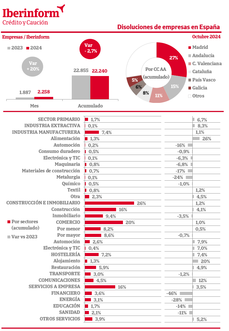 Los datos de octubre muestran que la disolución de empresas registró un aumento del 20% respecto al mismo mes del ejercicio anterior. En el conjunto del año acumula un decrecimiento del -2,7%. La destrucción de tejido empresarial se concentra en Madrid (27% del total), Andalucía (15%), la Comunidad Valenciana (11%) y Cataluña (8%). Por sectores de actividad, las disoluciones se concentran en construcción e inmobiliario (26% del total), seguidas del comercio (20%) y servicios a empresa (16%). Son menos intensas en los sectores de industria manufacturera (7,4%), hostelería (7,2%) y sector primario (1,7%).