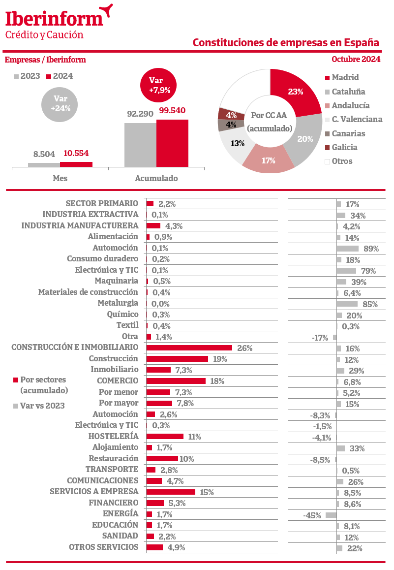 De acuerdo con el seguimiento de los registros mercantiles que realiza Iberinform, la constitución de nuevas empresas registró en octubre un aumento del 24% respecto al mismo mes del ejercicio anterior. En el conjunto del año la creación de tejido productivo acumula una subida del 7,9%. Las nuevas firmas se concentran en Madrid (23% del total), Cataluña (20%), Andalucía (17%) y la Comunidad Valenciana (13%). Por sectores de actividad, las constituciones se concentran en construcción e inmobiliario (26% del total), seguidas de comercio (18%), servicios a empresa (15%) y hostelería (11%).
