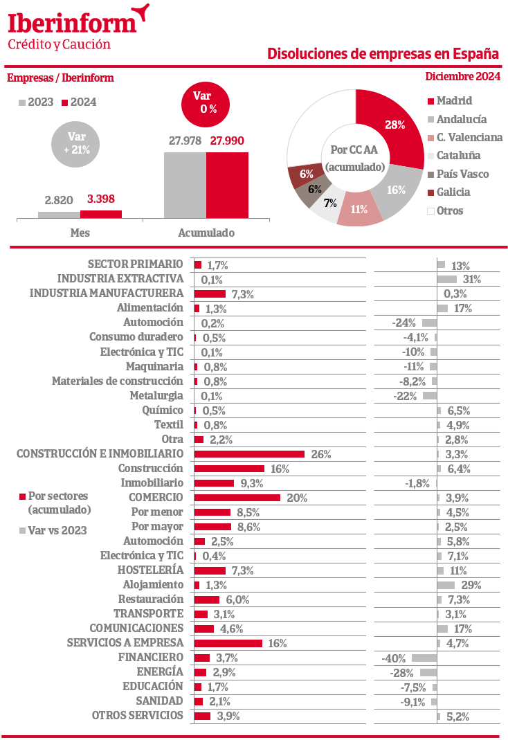 Los datos de diciembre muestran que la disolución de empresas registró un aumento del 21% respecto al mismo mes del ejercicio anterior. En el conjunto del año, no registra cambios. La destrucción de tejido empresarial se concentra en Madrid (28% del total), Andalucía (16%), la Comunidad Valenciana (11%) y Cataluña (7%). Por sectores de actividad, las disoluciones se concentran en construcción e inmobiliario (26% del total), seguidas del comercio (20%) y servicios a empresa (16%). Son menos intensas en los sectores de industria manufacturera y hostelería (7,3%) y sector primario (1,7%).