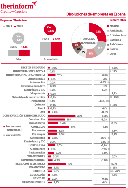 Los datos de febrero muestran que la disolución de empresas registró una disminución del -5,8% respecto al mismo mes del ejercicio anterior. En el conjunto del año, registró una disminución de -0,5%. La destrucción de tejido empresarial se concentra en Madrid (26% del total), Andalucía (16%), la Comunidad Valenciana (11%) y Cataluña (8%). Por sectores de actividad, las disoluciones se concentran en construcción e inmobiliario (25% del total), seguidas del comercio (19%) y servicios a empresa (16%). Son menos intensas en los sectores de industria manufacturera (7,1%), hostelería (6,7%) y sector primario (1,9%).