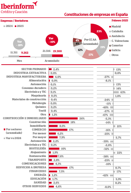 De acuerdo con el seguimiento de los registros mercantiles que realiza Iberinform, la constitución de nuevas empresas registró en febrero una disminución del -18% respecto al mismo mes del ejercicio anterior. En el conjunto del año la creación de tejido productivo acumula una bajada del -10%. Las nuevas firmas se concentran en Madrid (23% del total), Cataluña (19%), Andalucía (17%) y la Comunidad Valenciana (12%). Por sectores de actividad, las constituciones se concentran en construcción e inmobiliario (26% del total), seguidas de comercio y servicios a empresa (17%) y hostelería (10%).