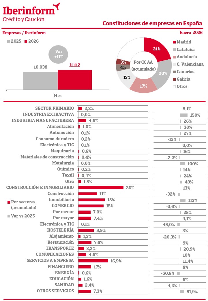 De acuerdo con el seguimiento de los registros mercantiles que realiza Iberinform, la constitución de nuevas empresas registró en enero un aumento del 11% respecto al mismo mes del ejercicio anterior. Las nuevas firmas se concentran en Madrid (21% del total), Cataluña (20%), Andalucía (17%) y la Comunidad Valenciana (13%). Por sectores de actividad, los mayores volúmenes de constituciones se encuentran en construcción e inmobiliario (26% del total), servicios a empresa (17%), comercio (15%) y hostelería (8,9%).