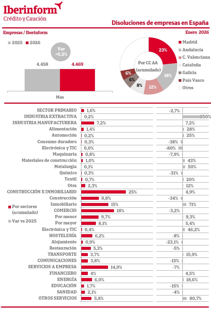 En cuanto a enero de 2026 con respecto al mismo mes del año anterior, los crecimientos más intensos de las disoluciones se registran en los sectores de la industria extractiva (350%), inmobiliario (71%) industria de metalurgia (50%), comercio de electrónica y TIC (46%) e industria de materiales de construcción (43%).
