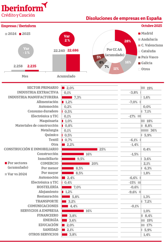 Los datos de octubre muestran que la disolución de empresas registró una disminución del -1% respecto al mismo mes del ejercicio anterior. En el conjunto del año, registró una subida del 2%. La destrucción de tejido empresarial se concentra en Madrid (28% del total), Andalucía (16%), la Comunidad Valenciana (11%) y Cataluña (7%).