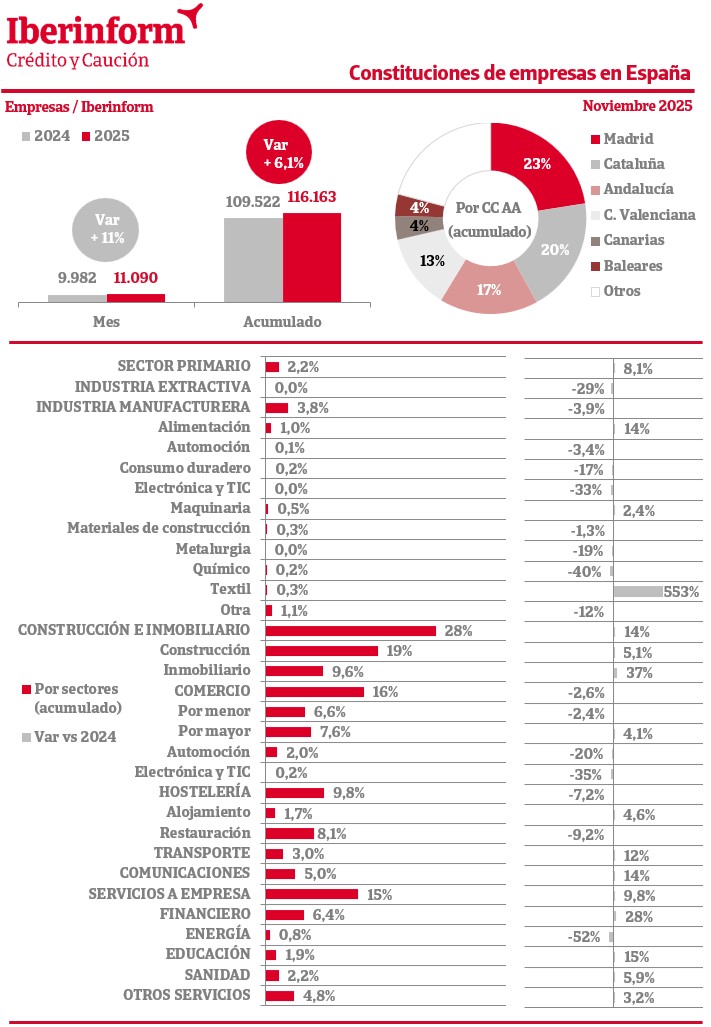 De acuerdo con el seguimiento de los registros mercantiles que realiza Iberinform, la constitución de nuevas empresas registró en noviembre un aumento del 11% respecto al mismo mes del ejercicio anterior. En el conjunto del año la creación de tejido productivo acumula una subida del 6,1%. Las nuevas firmas se concentran en Madrid (23% del total), Cataluña (20%), Andalucía (17%) y la Comunidad Valenciana (13%). Por sectores de actividad, los mayores volúmenes de constituciones se encuentran en construcción e inmobiliario (28% del total), comercio (16%), servicios a empresa (15%) y hostelería (9,8%).