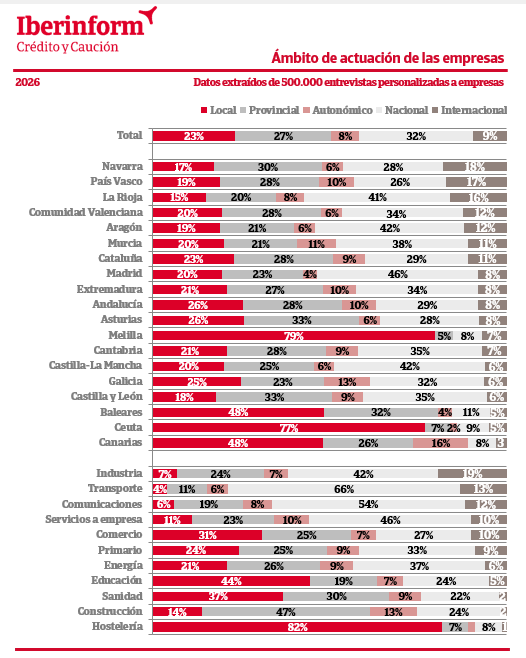 Las empresas estrictamente locales están cuatro puntos por encima de los valores prepandémicos. Este porcentaje de empresas locales se dispara en los territorios insulares como Baleares (48%) o Canarias (48%). Por sectores, las empresas de hostelería (82%), educación (44%), sanidad (37%) y comercio (31%) son las más locales en contraste con las empresas logísticas (4%), de comunicaciones (6%) e industriales (7%).