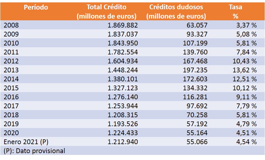 Recuerdo que la tasa de morosidad bancaria se obtiene dividiendo el saldo vivo de los créditos dudosos (55.066 millones de euros a finales de enero), entre el saldo vivo del total de crédito concedido (1,213 billones de euros). Ambos saldos se han reducido en enero de 2021, aunque el de total de crédito lo ha hecho en mayor proporción, de ahí el incremento de la tasa.