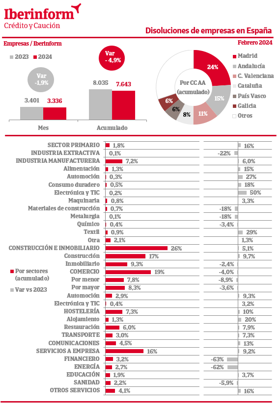 Los datos de febrero muestran que la disolución de empresas registró una disminución del -1,9% respecto al mismo mes del ejercicio anterior. En el conjunto del año acumula un decrecimiento del -4,9%. La destrucción de tejido empresarial se concentra en Madrid (24% del total), Andalucía (15%), la Comunidad Valenciana (11%) y Cataluña (8%). Por sectores de actividad, las disoluciones se concentran en construcción e inmobiliario (26% del total), seguidas del comercio (19%) y servicios a empresa (16%). Son menos intensas en los sectores de hostelería (7,3%), industria manufacturera (7,2%) y sector primario (1,8%).